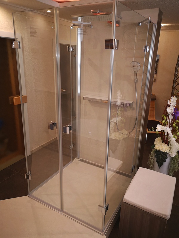 Frei im Raum stehende Dusche, geklappt   Frei im Raum stehende Dusche